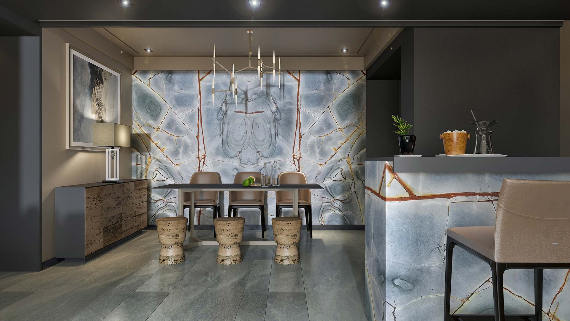 Distinctive Aesthetic Appeal: The combination of blue, gray, and warm rust veins creates a visually engaging surface that enhances architectural and design projects.