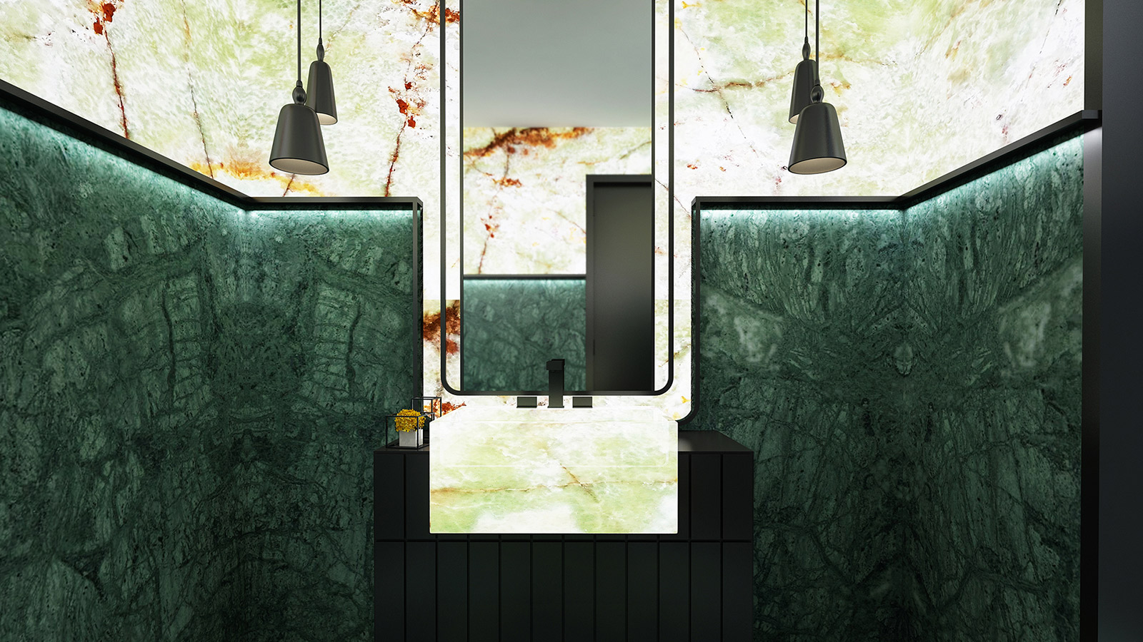 Green Onyx is ideal for wall claddings, TV units, bathroom vanities, feature walls, and flooring, offering a sophisticated aesthetic. Its light-transmitting properties make it especially valuable for illuminated surfaces, adding depth and dimension to high-end designs.