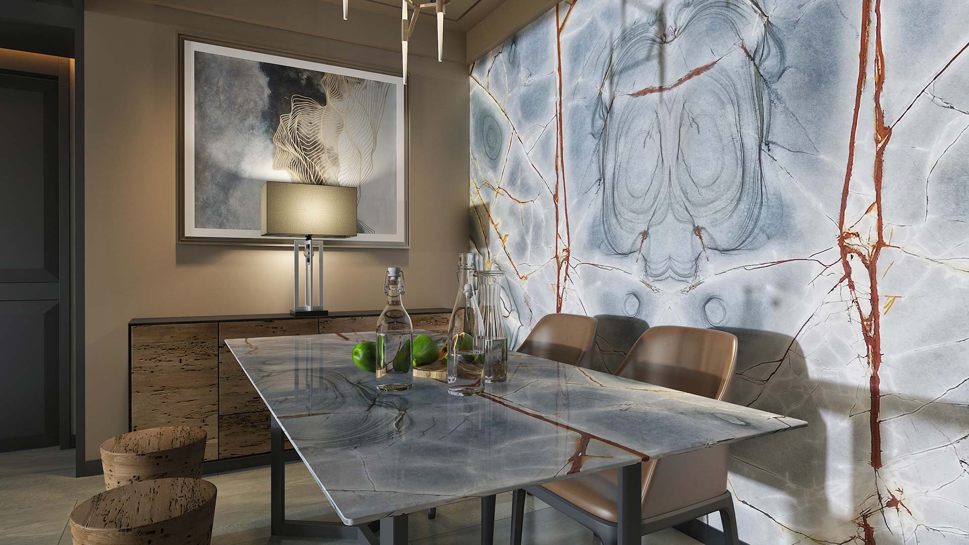 Distinctive Aesthetic Appeal: The combination of blue, gray, and warm rust veins creates a visually engaging surface that enhances architectural and design projects.