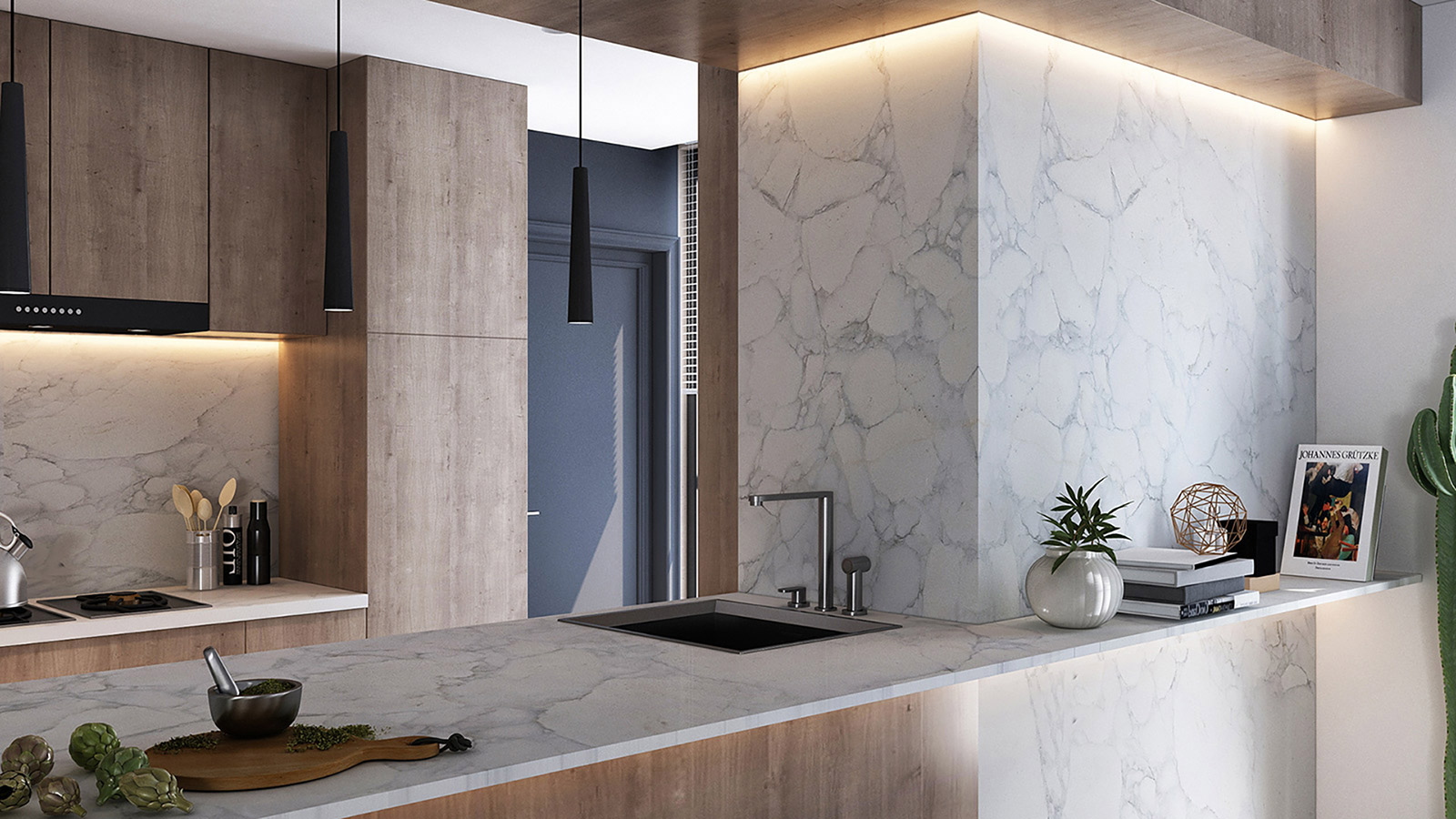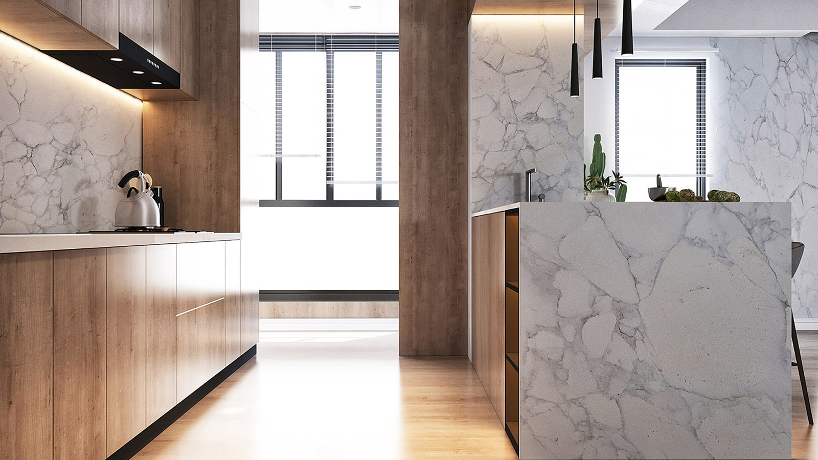 • Color and Texture: Calacatta Caldia features a bright white base enriched with prominent gray veining, creating a striking yet balanced visual effect.