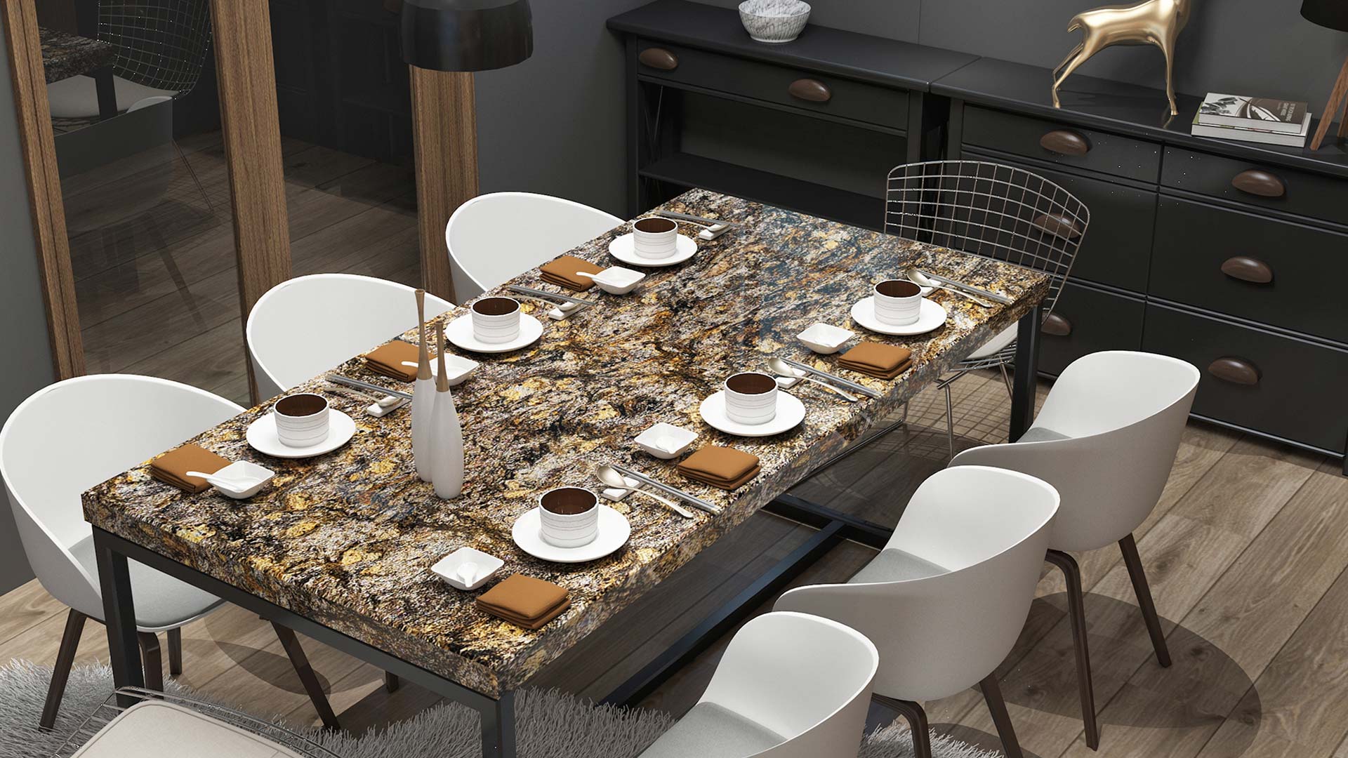- Rich Color Contrast: A striking mix of black, gold, and metallic flecks.
